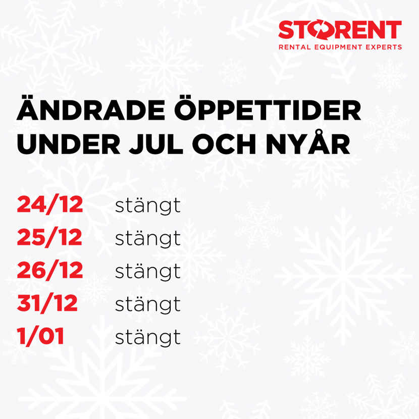 <figure class="image"><img style="aspect-ratio:830/830;" src="https://images.storent.com/pw-public/SE/cms/STO-darba-laiks-1080x1080-swe_xl.webp" width="830" height="830"></figure><p style="text-align:center;"><span style="background-color:rgb(255,255,255);color:rgb(8,8,9);">Kära kunder! Observera våra ändrade öppettider under helgerna <span class="html-span xexx8yu xyri2b x18d9i69 x1c1uobl x1hl2dhg x16tdsg8 x1vvkbs x3nfvp2 x1j61x8r x1fcty0u xdj266r xat24cr xm2jcoa x1mpyi22 xxymvpz xlup9mm x1kky2od"><img class="xz74otr x15mokao x1ga7v0g x16uus16 xbiv7yw" src="https://static.xx.fbcdn.net/images/emoji.php/v9/taf/2/16/2744.png" alt="❄️" width="16" height="16" referrerpolicy="origin-when-cross-origin"></span></span></p>